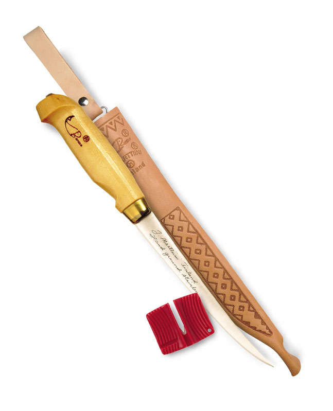 Rapala Fillet Knives, made by Marttiini, are a gold standard of fishing knives, and they come in different sizes, from 6”to 9”. These knives are extra sharp, and they also come with a little hand sharpener to touch it up. Progressively tapered, flexible, full-tang blade of European stainless steel that takes and holds an ultra-sharp edge is securely anchored in legendary engraved birch handle.